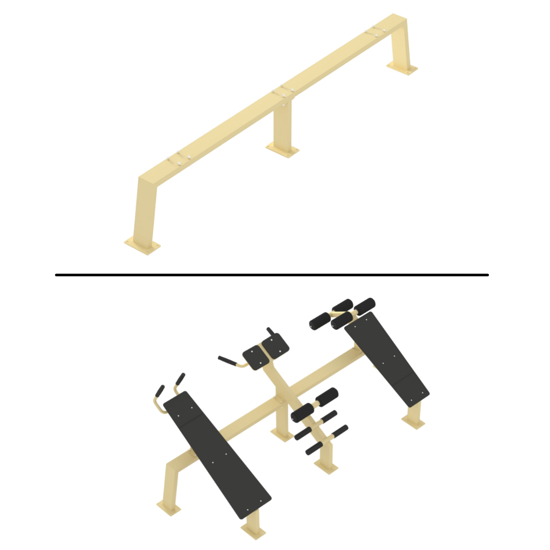 The purpose of the triple base Explode KF816.3 is to be a base for different training machines of the KF816 line. Among them are a bench press, bench for a reverse crunch, and a hyperextension.