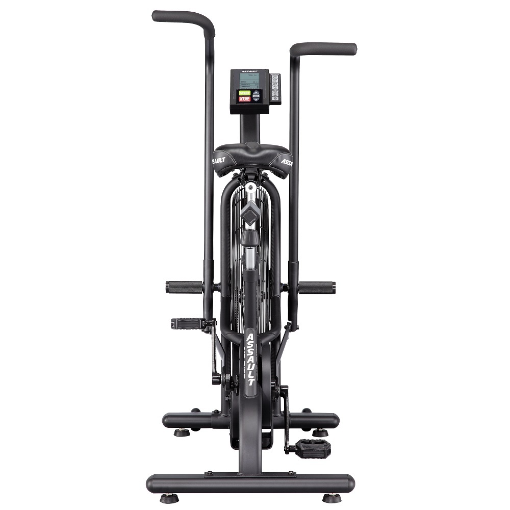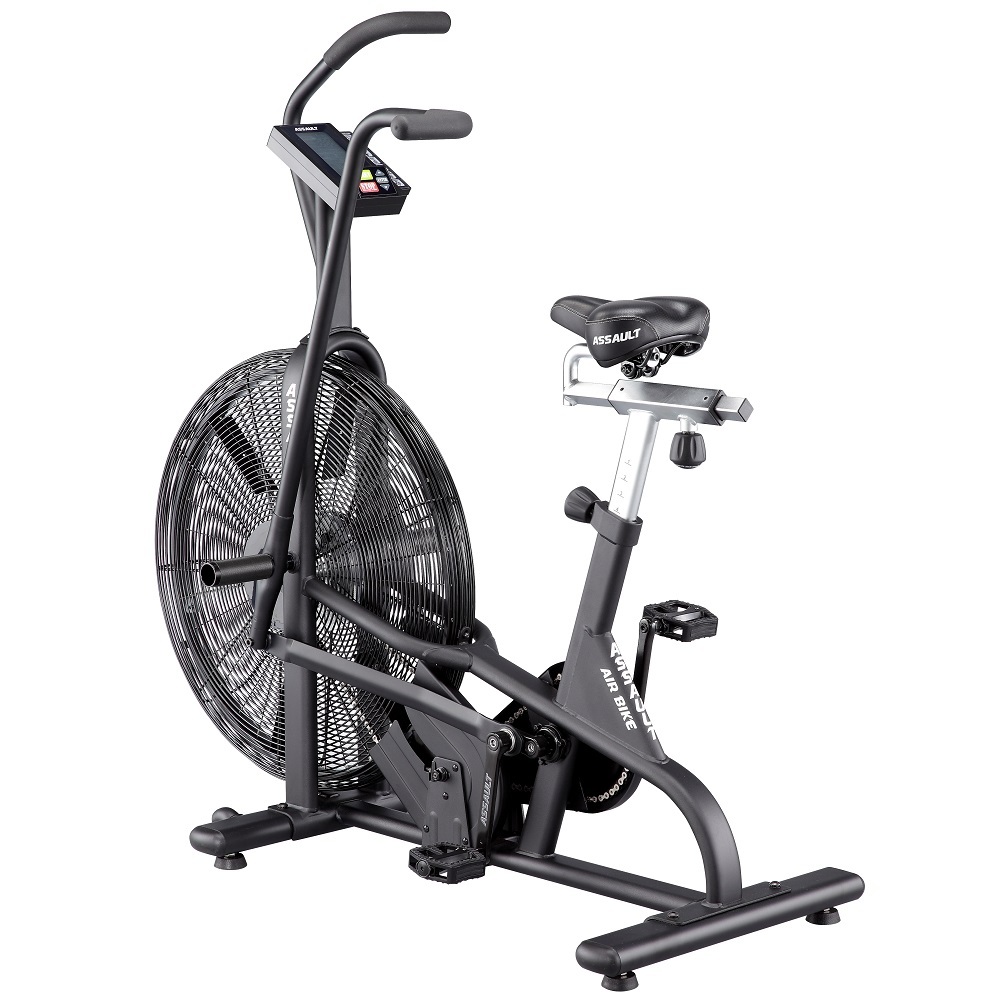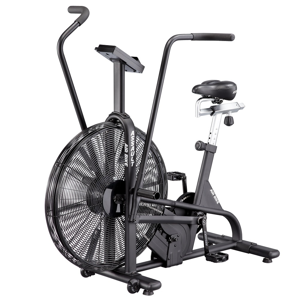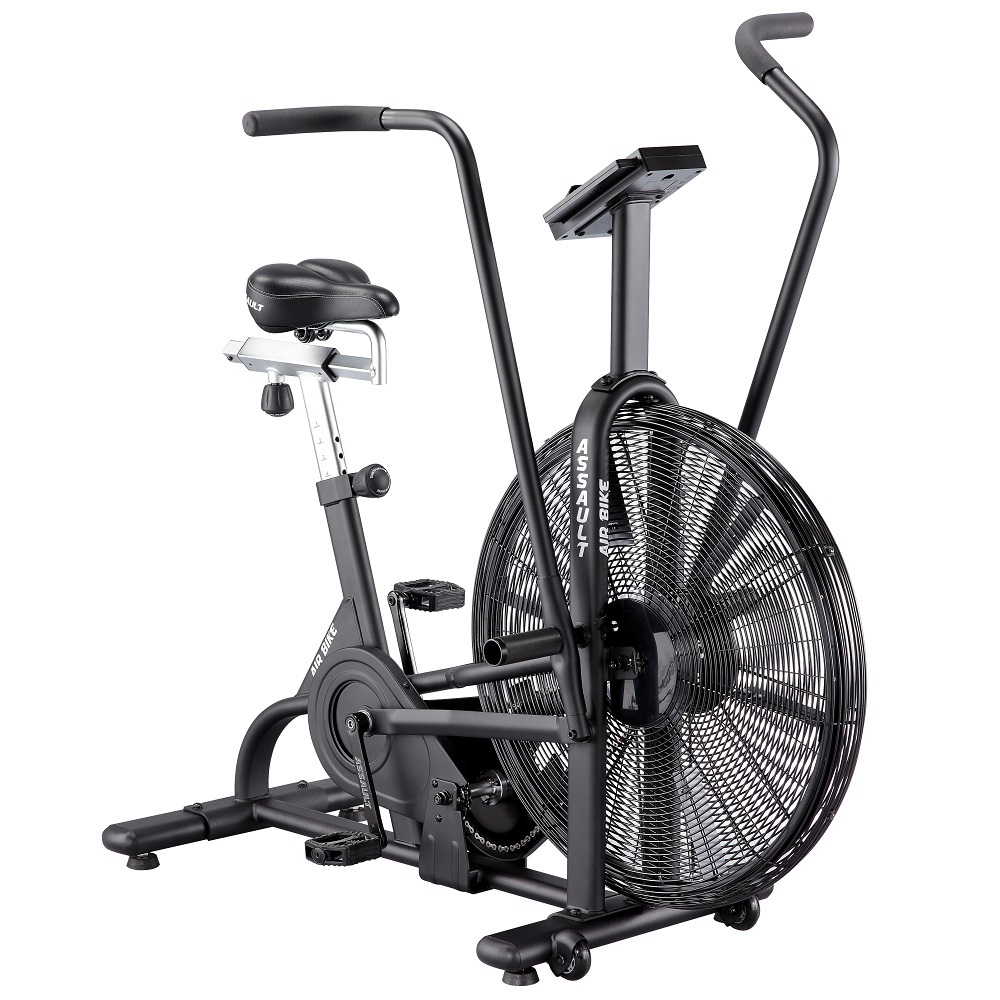 Велотренажер Ассаулт AirBike укомплектований комфортними ручками, зручним сидінням, універсальною ручною педаллю, комфортними тримачами, високоякісними сайлентблоками, педалями та сталевою молібденовою рамою. Повітряний маховик дозволяє швидше прокачати м'язи ніг, зміцнити поперек, черевний прес, на відміну від звичайного велотренажера. Assault AirBike спроєктований і перевірений атлетами та фітнес-тренерами, є унікальним тренажером для ефективних і результативних тренінгів і визнаний кращим серед вентиляторних велотренажерів для використання в кросфіт-клубах. Унікальність Assault AirBike в індивідуальних налаштуваннях, і не тільки сидіння і заліза, а й програм тренувань: контролюйте частоту серцевого ритму або переходите до високоінтенсивного інтервального тренування. Велотренажери Assault AirBike - це найпопулярніші велотренажери в кросфіті.