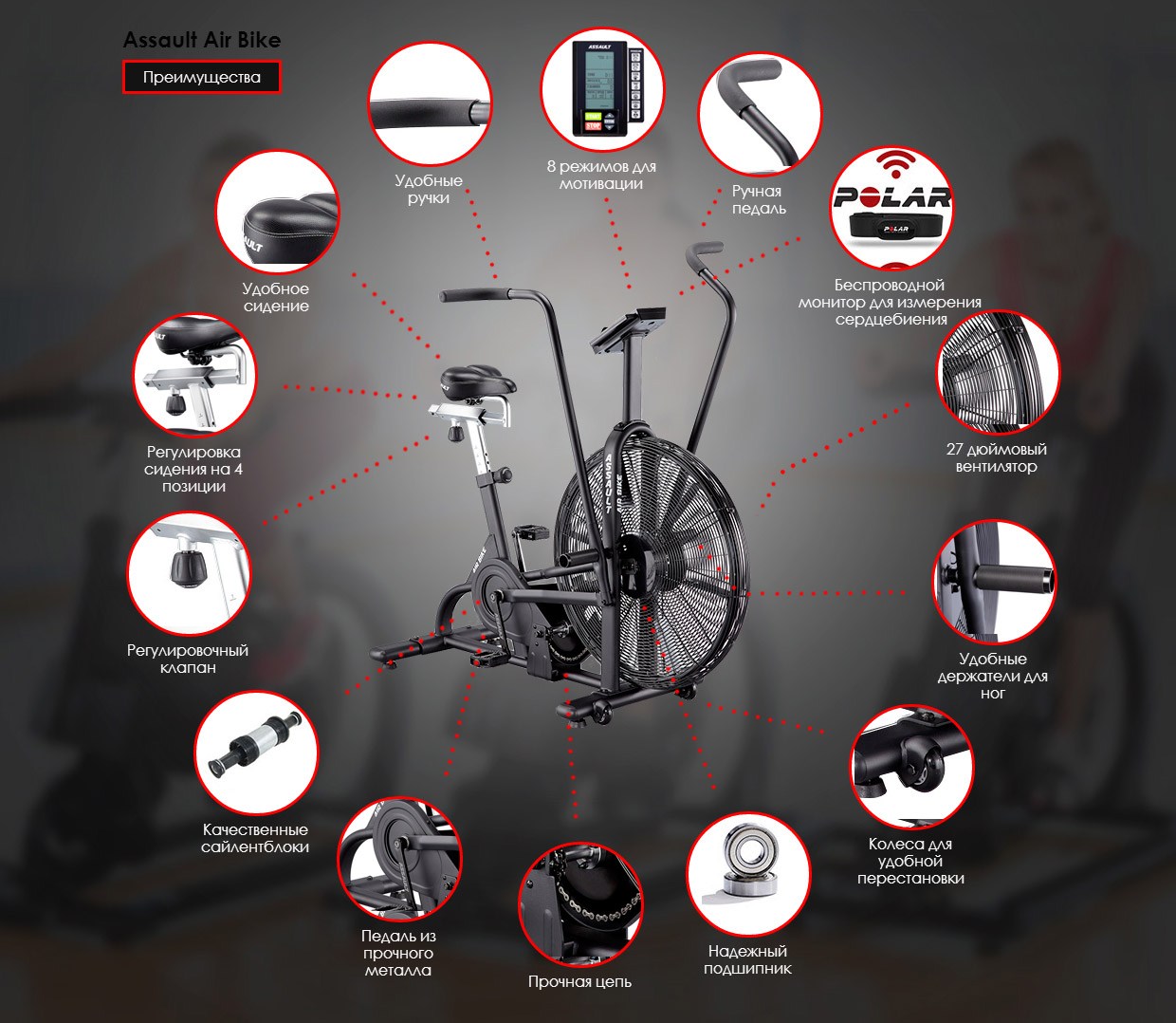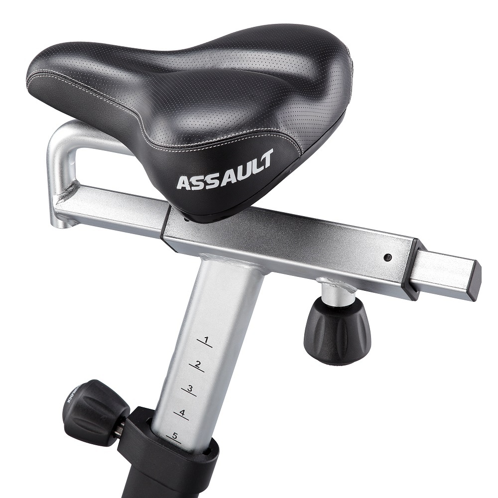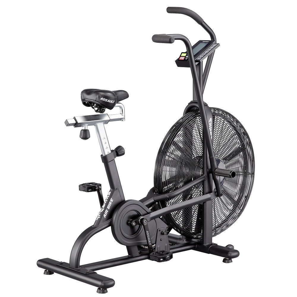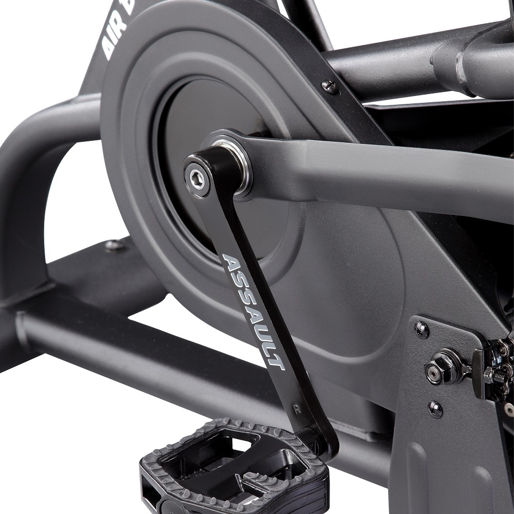 Велотренажер Ассаулт AirBike укомплектований комфортними ручками, зручним сидінням, універсальною ручною педаллю, комфортними тримачами, високоякісними сайлентблоками, педалями та сталевою молібденовою рамою. Повітряний маховик дозволяє швидше прокачати м'язи ніг, зміцнити поперек, черевний прес, на відміну від звичайного велотренажера. Assault AirBike спроєктований і перевірений атлетами та фітнес-тренерами, є унікальним тренажером для ефективних і результативних тренінгів і визнаний кращим серед вентиляторних велотренажерів для використання в кросфіт-клубах. Унікальність Assault AirBike в індивідуальних налаштуваннях, і не тільки сидіння і заліза, а й програм тренувань: контролюйте частоту серцевого ритму або переходите до високоінтенсивного інтервального тренування. Велотренажери Assault AirBike - це найпопулярніші велотренажери в кросфіті.